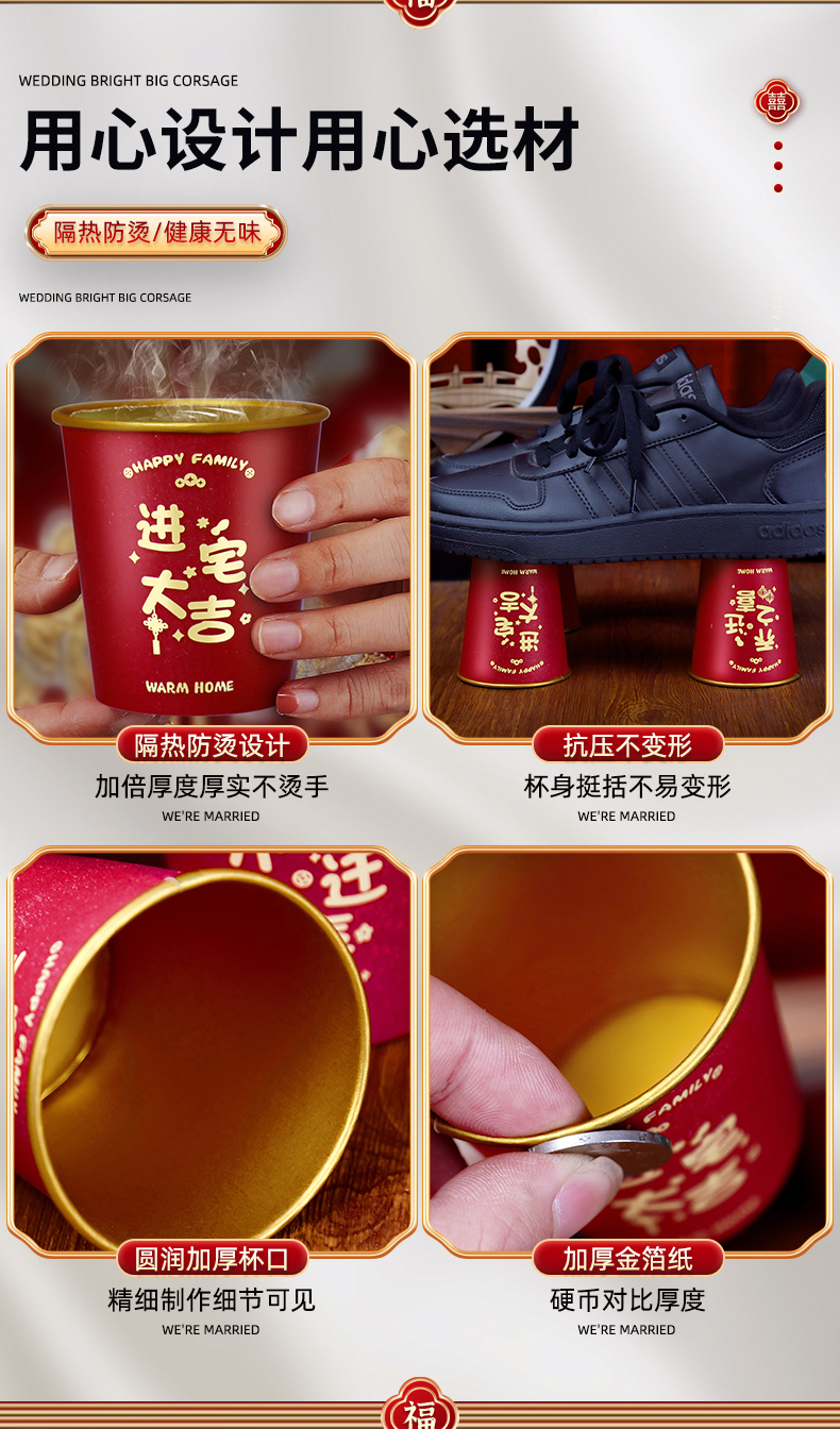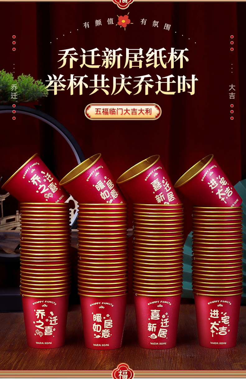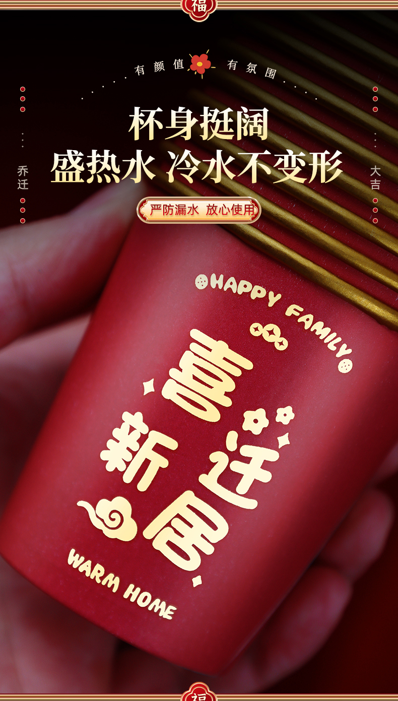 乔迁之喜纸杯新居搬家入宅仪式加厚一次性红色高档金箔水杯子